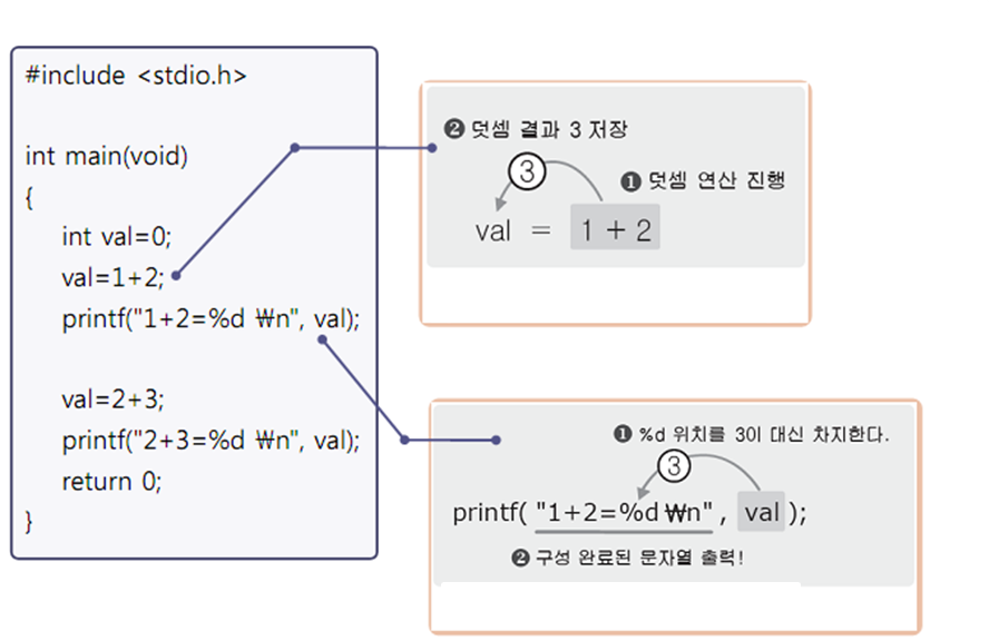 - C언어에서는 main 함수를 실행할 때 행 단위로 위에서 아래로 순서대로 인식한다.